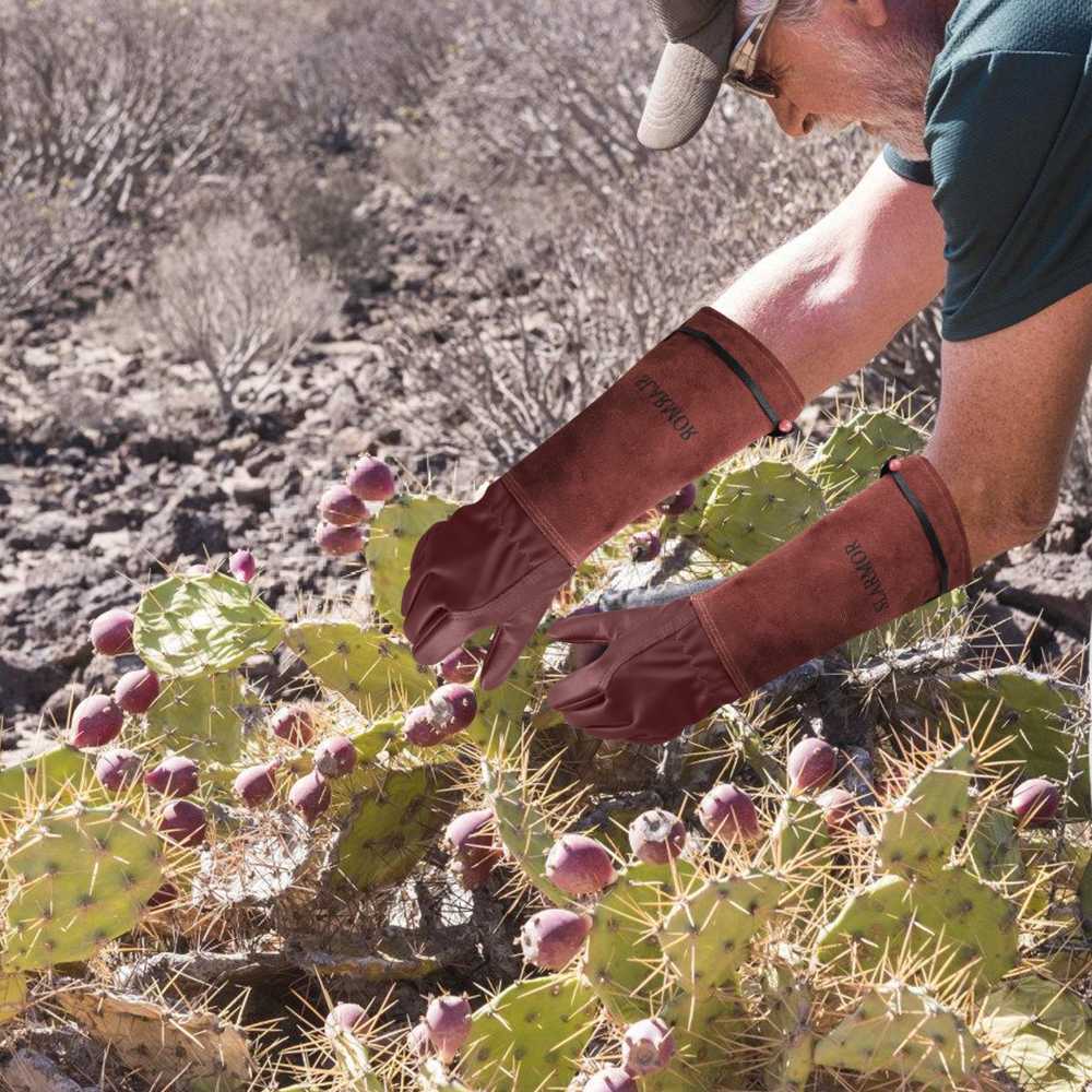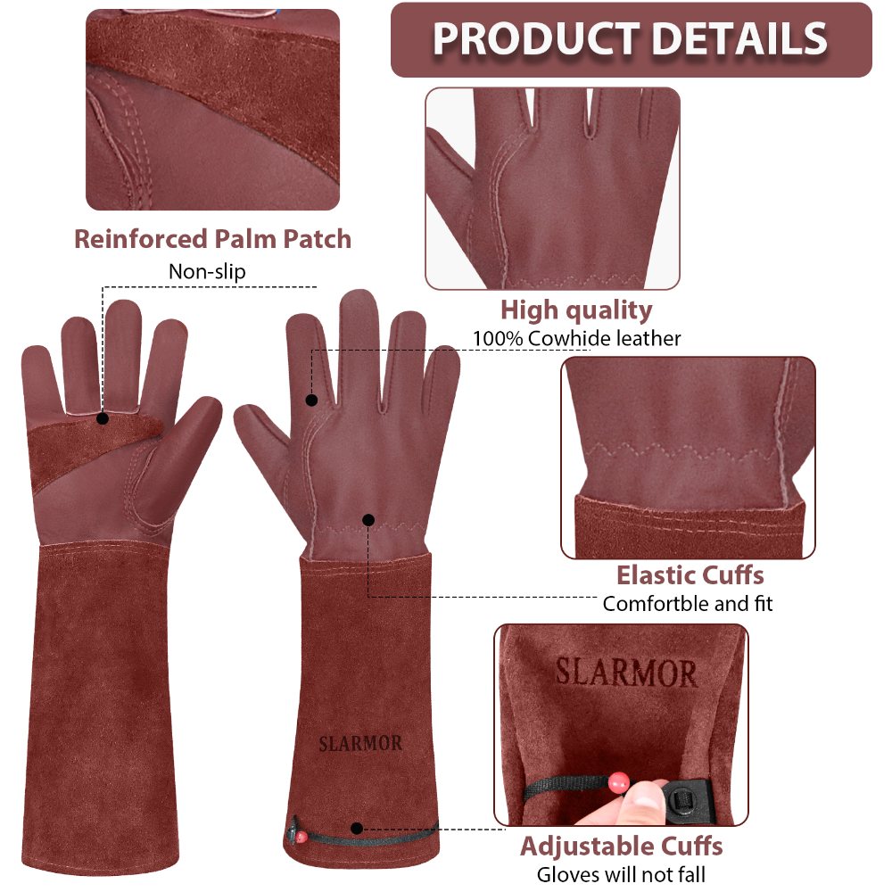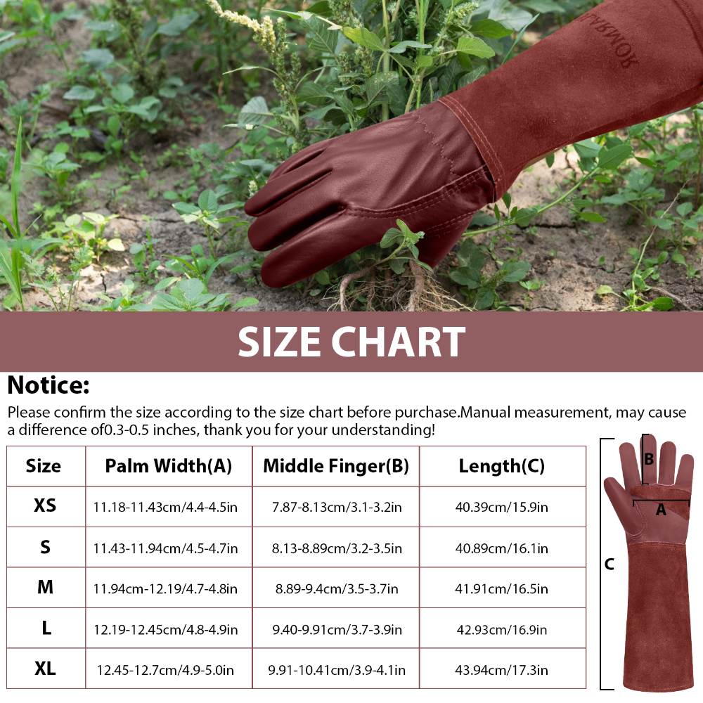 FULL PROTECTION LEATHER GARDEN GLOVES: This palm part is made of full grain cowhide for wear resisting, suit for doing various chores in your yard. Elbow-length gauntlet will offer protection all the way until your elbow. Extended cowhide leather cuff protects forearms from cuts and scratches, long pruning gloves allowing you free from your roses painlessly and has good anti-bite effect.Our rose pruning gloves are thorn and scratch resistant.