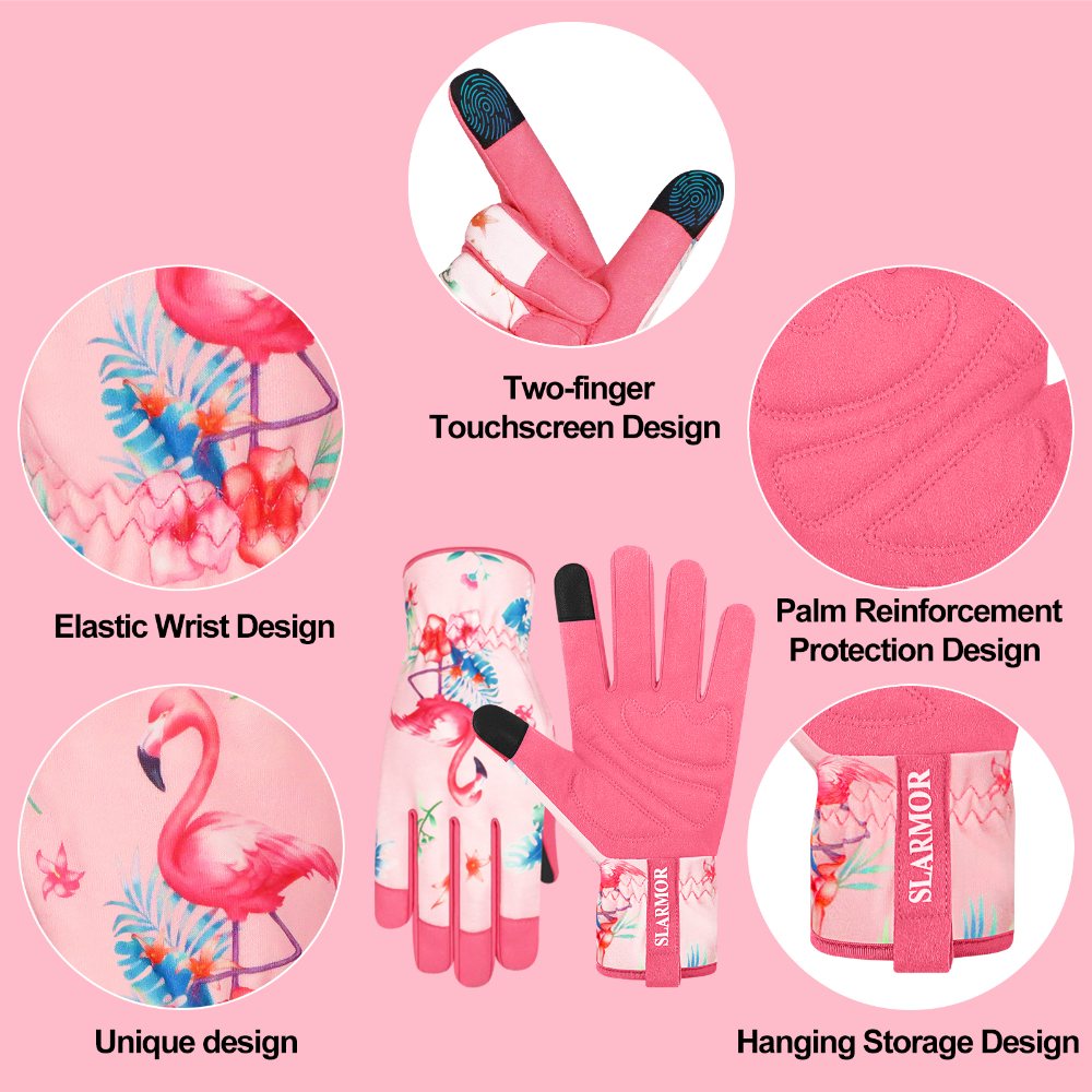 TOUCH SCREEN DESIGN WOMEN GARDENING GLOVES:The garden work gloves women with special touch screen design, which more humanization. The unique and practical 2 touchscreen capability design(thumb&forefinger) that assures you won't have to remove the glove in order to use your phone. Safety working gloves ensure snug fit with amazing flexibility& comfort
